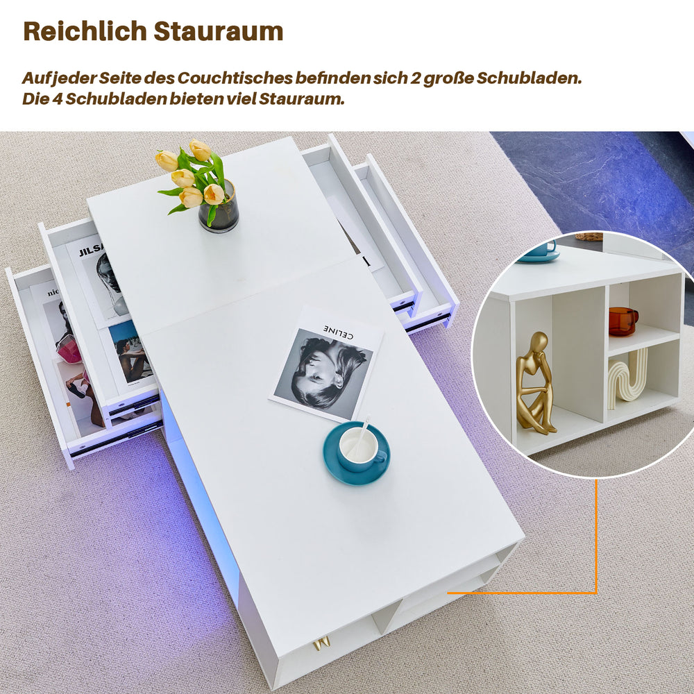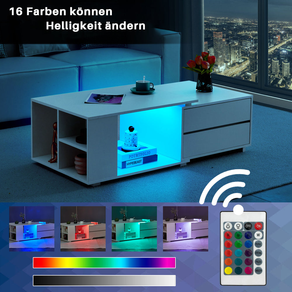 Dieser Couchtisch mit Stauraum ist mit seiner klaren Silhouette und den auffälligen LED-Leuchten am Sockel ein ultramodernes Herzstück für Ihr Wohnzimmer.