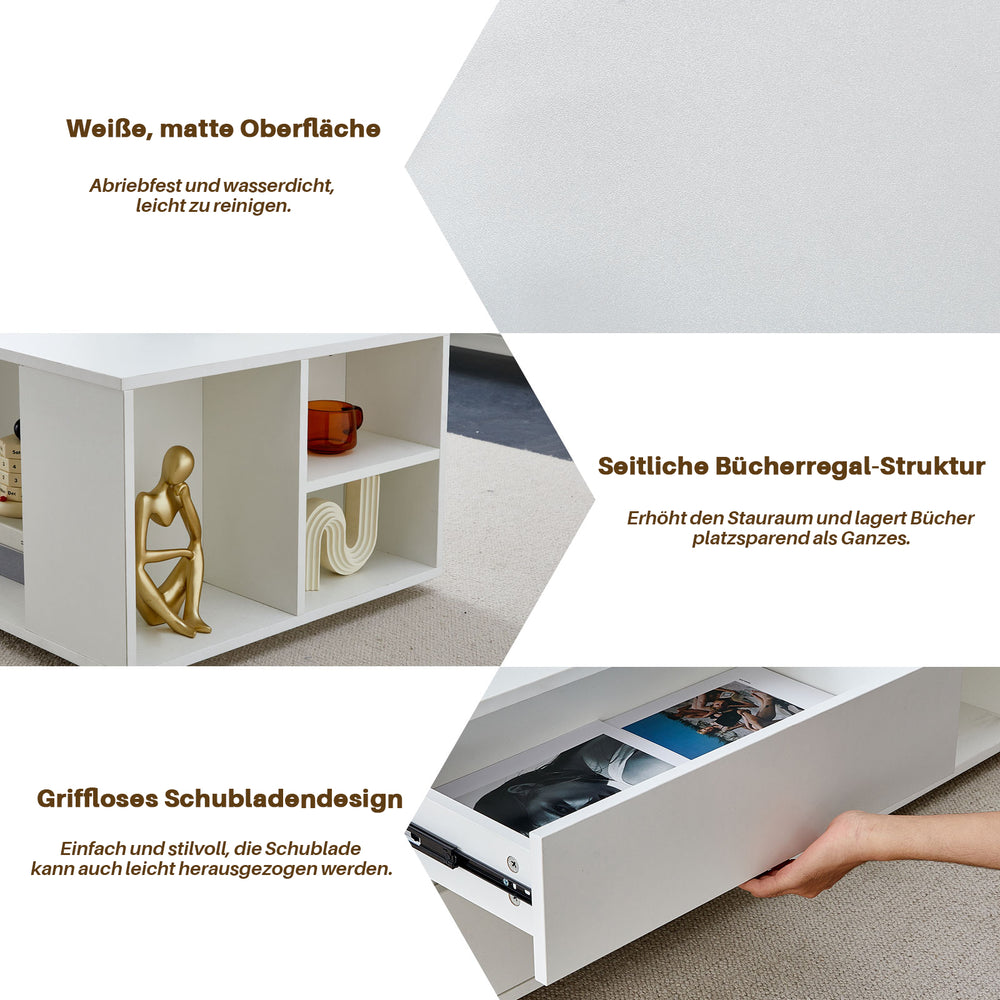 Die 4 Schubladen auf beiden Seiten und die 4 offenen Einlegeböden bieten nützlichen Stauraum.