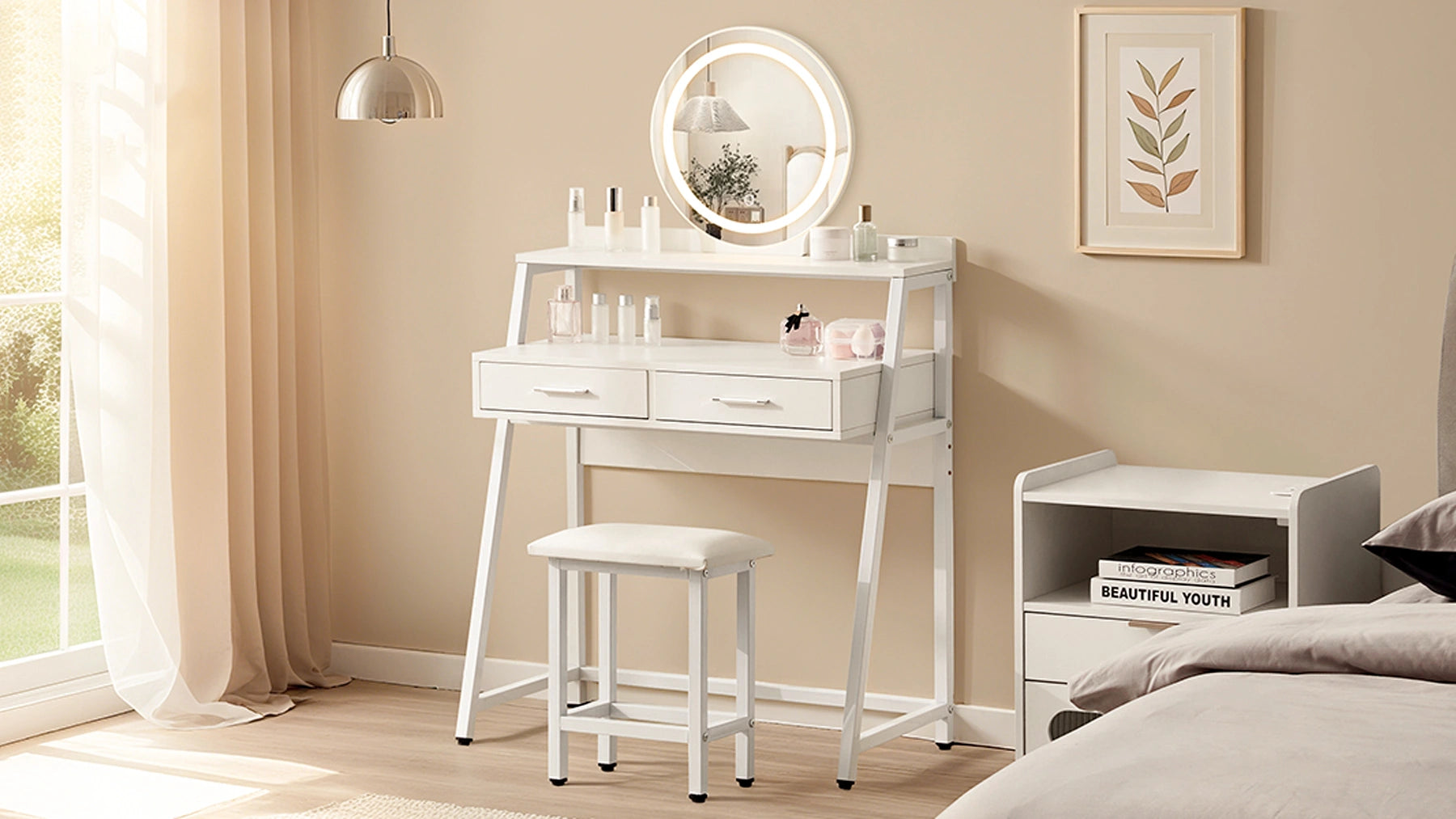 Zwei Schubladen und offene Ablagen bieten Platz für Kosmetik und Accessoires. Der passende Hocker ergänzt das Set und sorgt für zusätzlichen Komfort.