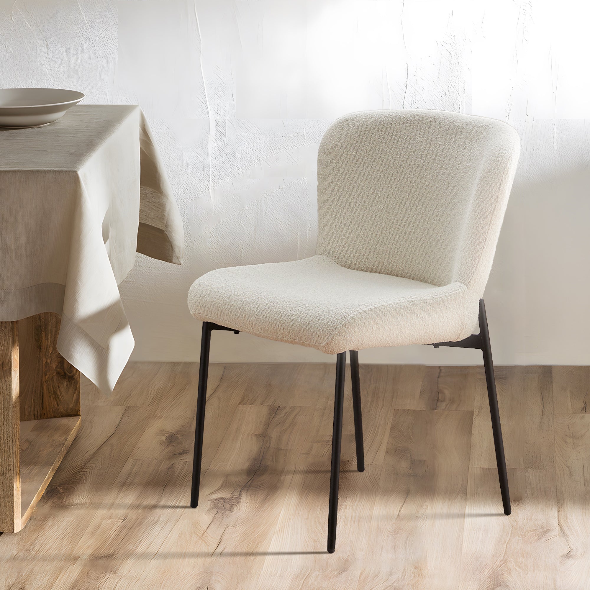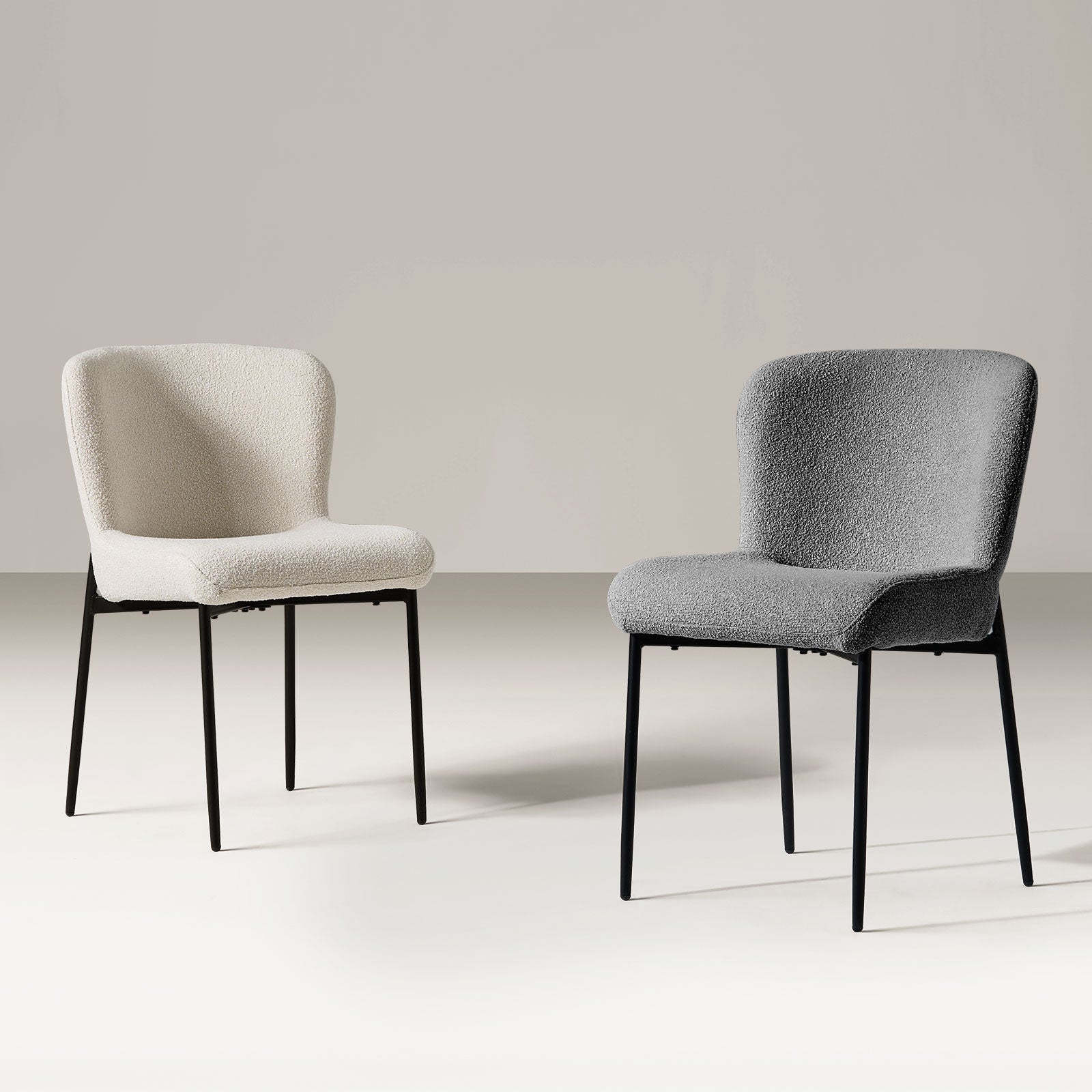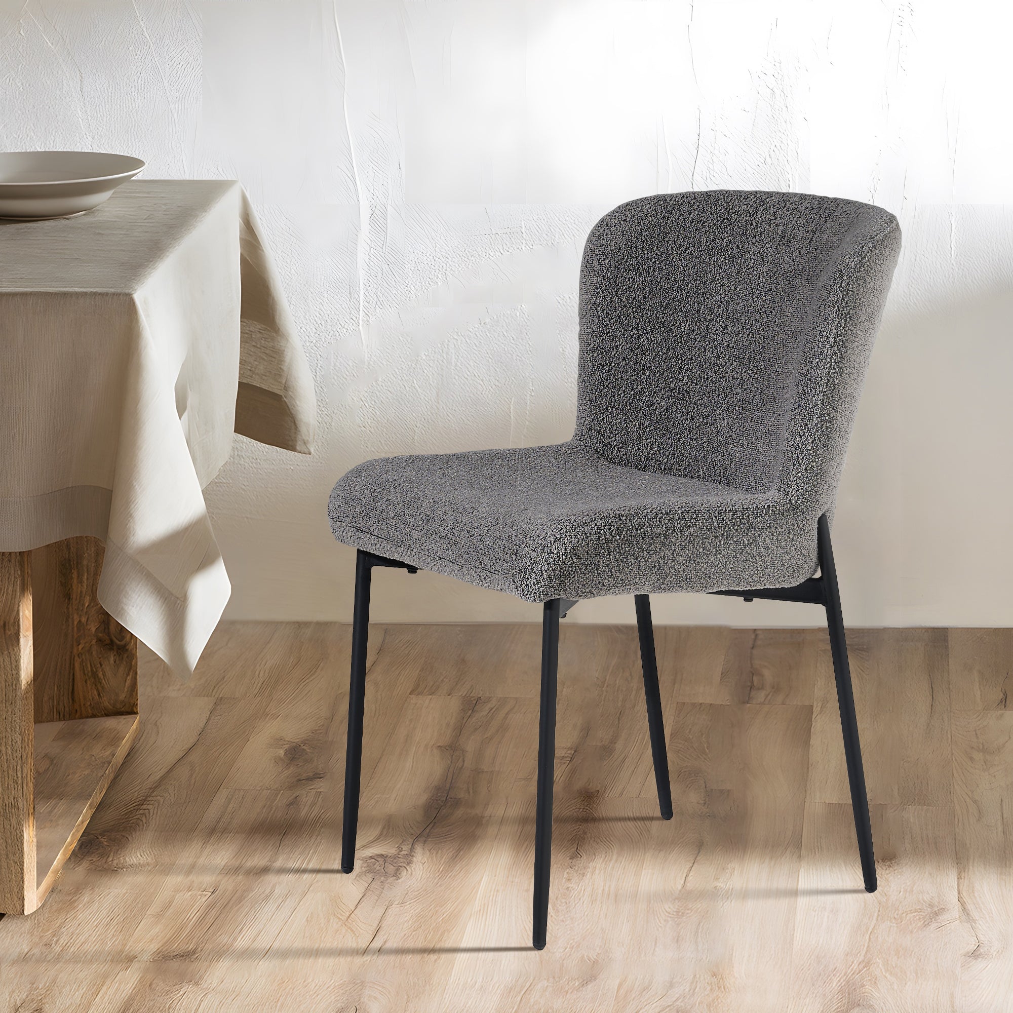 Der mit weichem Bouclé-Stoff bezogene Stuhl verleiht Ihrem Raum Struktur und Wärme. Die kuschelige, kuschelige Polsterung sieht nicht nur schick aus, sondern fühlt sich auch einladend an – eine stilvolle und praktische Wahl für den Alltag.