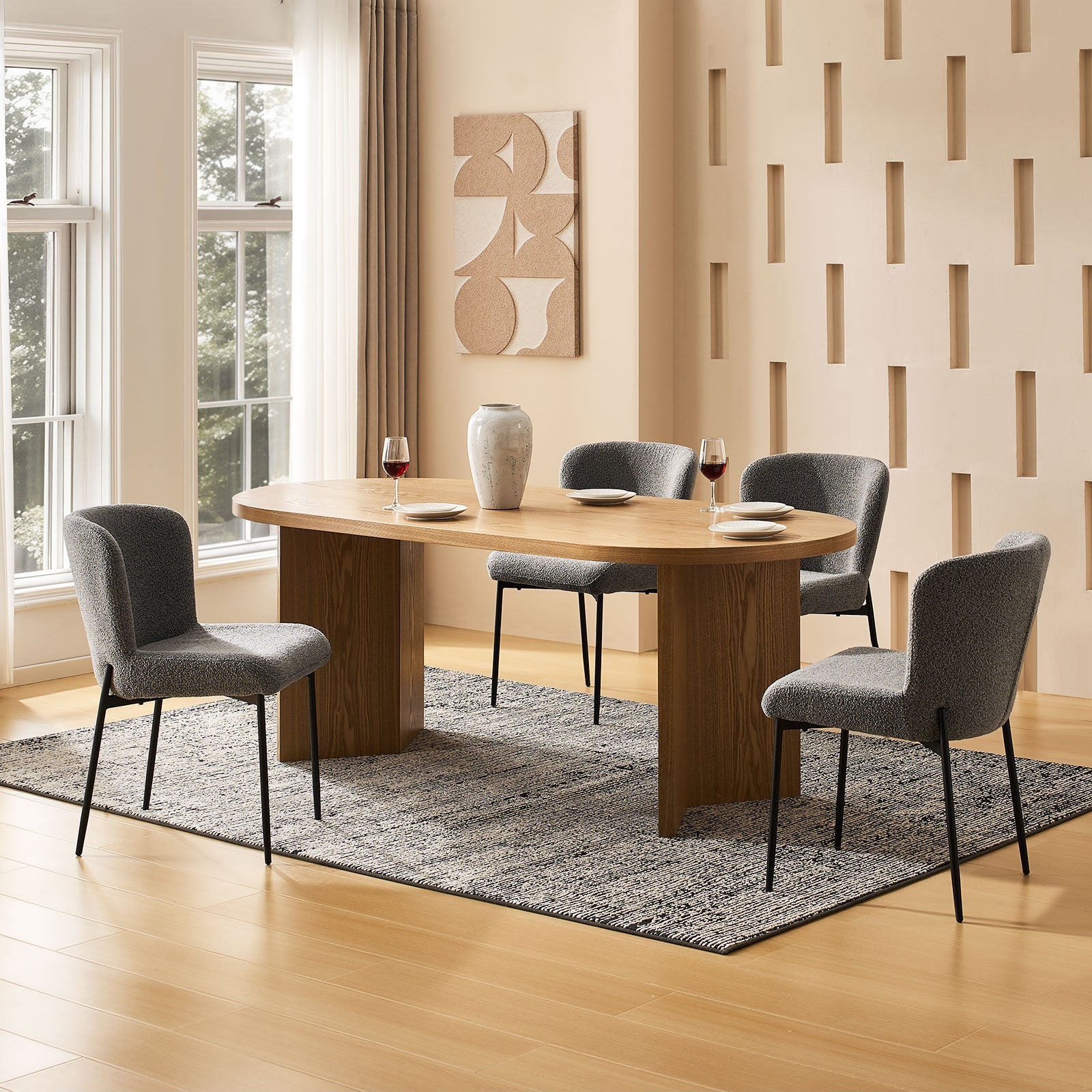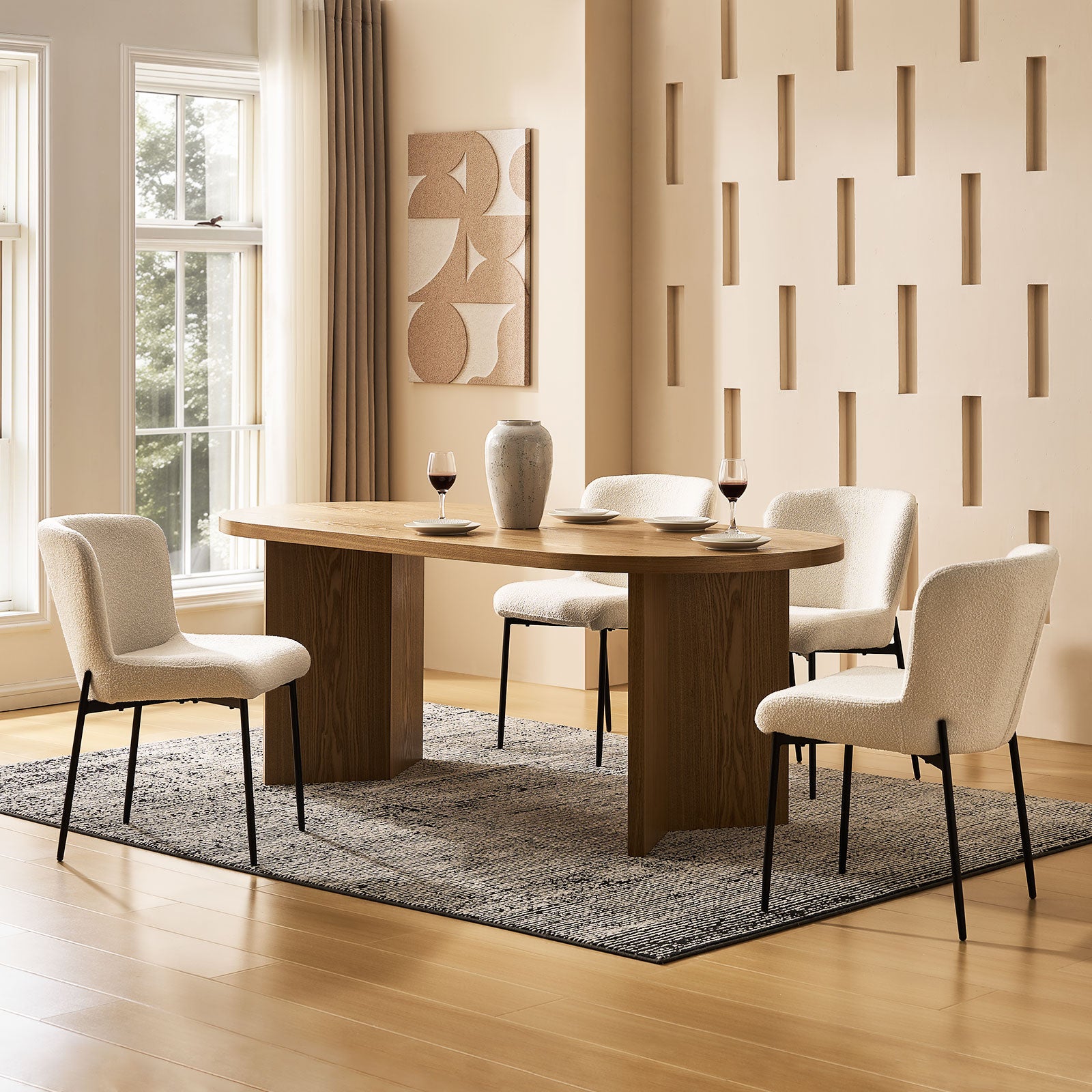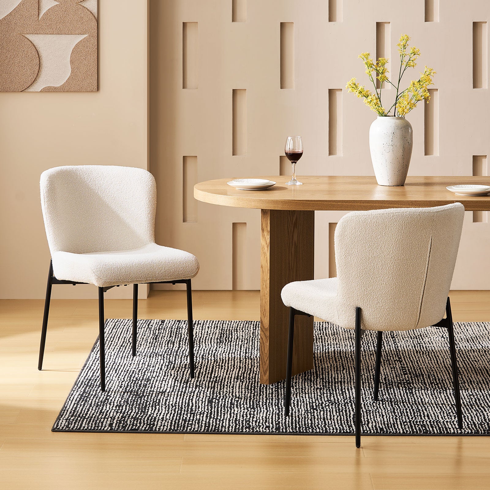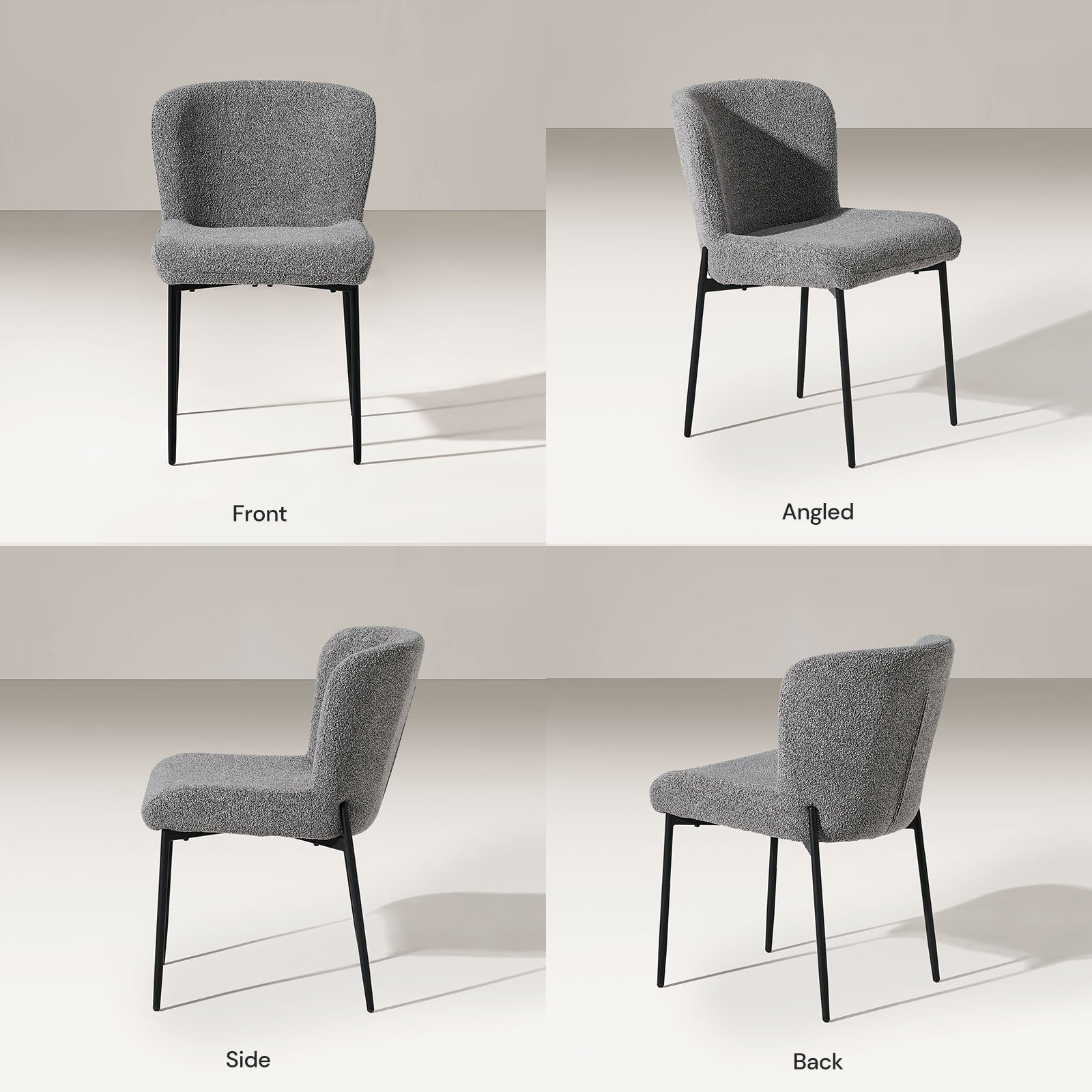 Der mit weichem Bouclé-Stoff bezogene Stuhl verleiht Ihrem Raum Struktur und Wärme. Die kuschelige, kuschelige Polsterung sieht nicht nur schick aus, sondern fühlt sich auch einladend an – eine stilvolle und praktische Wahl für den Alltag.