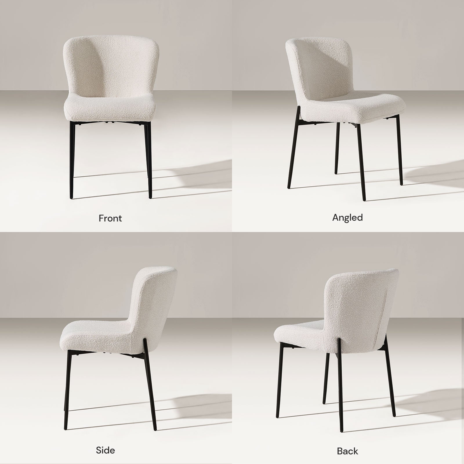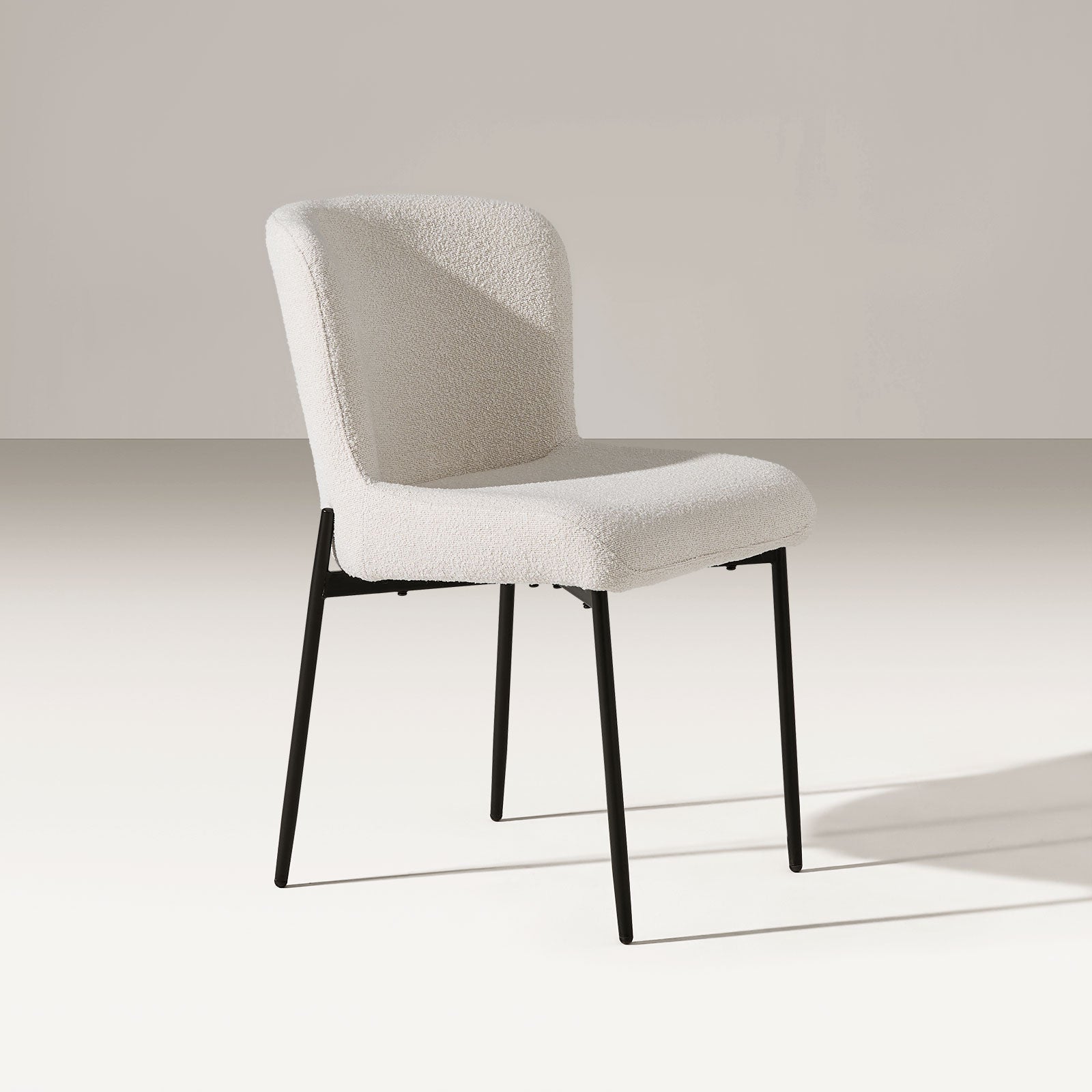 Der Celeste Esszimmerstuhl besticht durch eine elegante Sitzschale, weichen Bouclé-Stoff und eine stützende hohe Rückenlehne – alles in einem klaren, armlosen Design. Perfekt zum Essen oder Entspannen – ein gemütliches, modernes Möbelstück, das sich mühelos in jeden Raum einfügt.