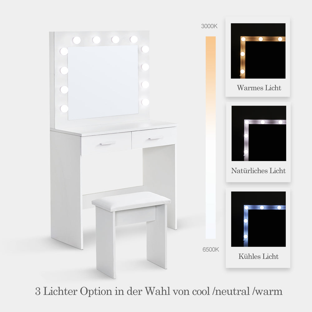 Hollywood Schminktisch Weiß mit LED Beleuchtung, Spiegel, großen Schubladen und Hocker