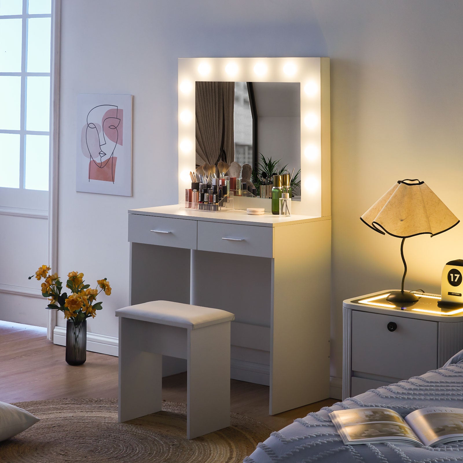 Hollywood-Leuchtmittel: Der Schminktisch ist mit 12 LED-Lampen am Rand des Spiegels ausgestattet. Die LED-Leuchten sind CE- und RoHS-zertifiziert und strahlen weiches Licht aus, das sich nach Ihren Make-up-Anforderungen anpassen lässt.