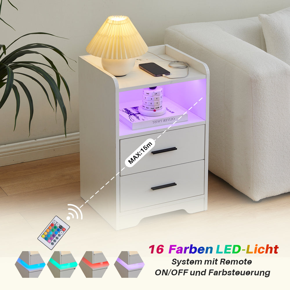 Kumar Hochglanz Nachttisch Weiß mit Steckdose & USB, Ladefunktion, LED Licht und 2 Schubladen
