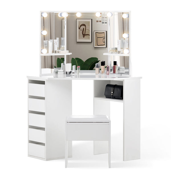 Roze Eck Schminktisch weiß mit Spiegel, LED Beleuchtung und Hocker