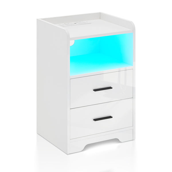 Kumar Hochglanz Nachttisch Weiß mit Steckdose & USB, Ladefunktion, LED Licht und 2 Schubladen
