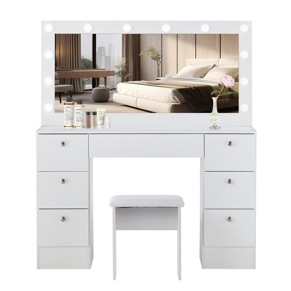 Hollywood Schminktisch Weiß mit LED Beleuchtung, Spiegel, großen Schubladen und Hocker