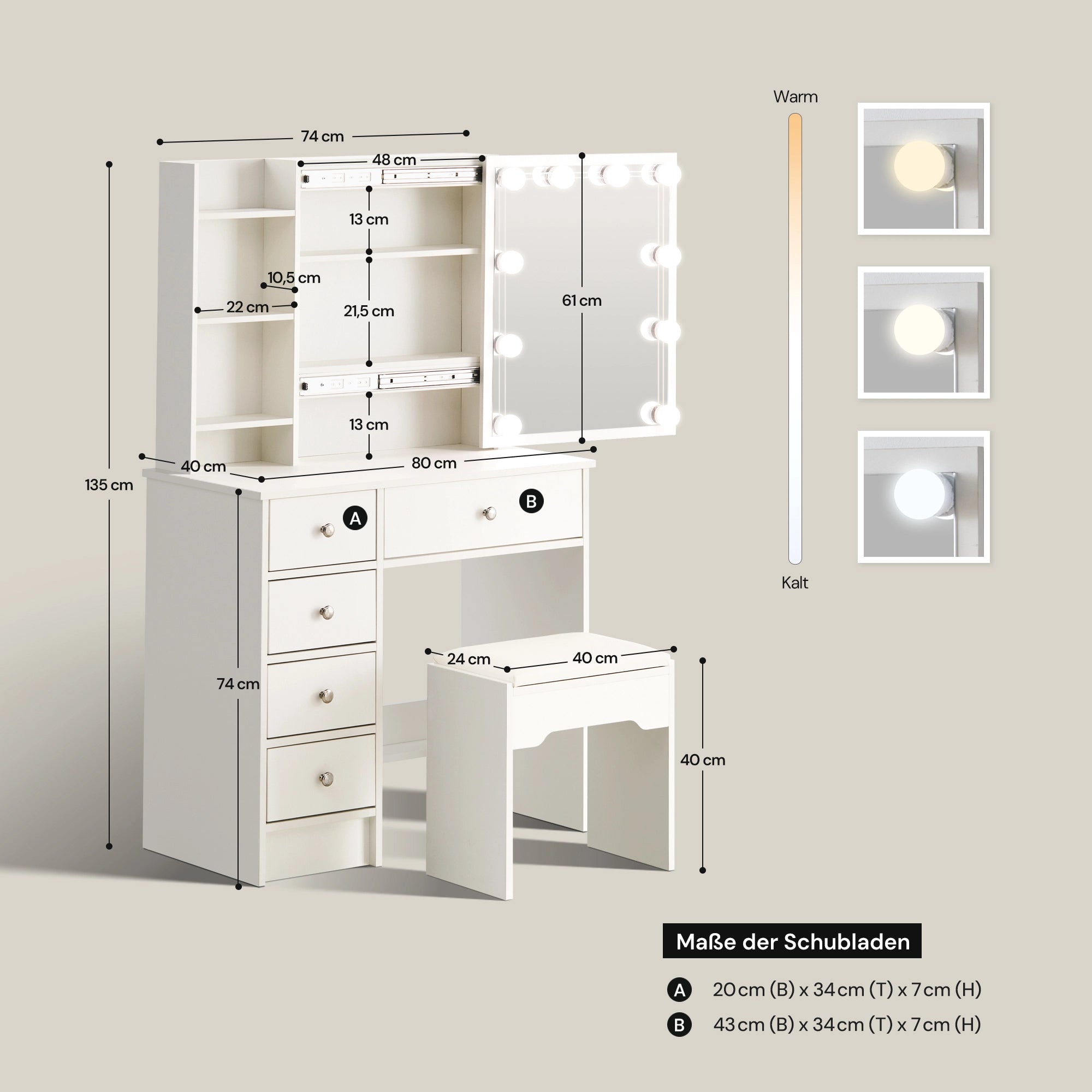 Der Schminktisch verfügt über einen dezent integrierten Spiegel, der eine klare und verlässliche Nutzung im täglichen Pflege- und Schminkprozess ermöglicht. Zehn harmonisch angeordnete LED-Lampen erzeugen eine gleichmäßige, ruhige Ausleuchtung und unterstützen ein kontrolliertes Lichtbild. Dank drei wählbarer Lichtfarben – Warm-, Neutral- und Kaltlicht – lässt sich die Beleuchtung gezielt an unterschiedliche Situationen und persönliche Vorlieben anpassen.