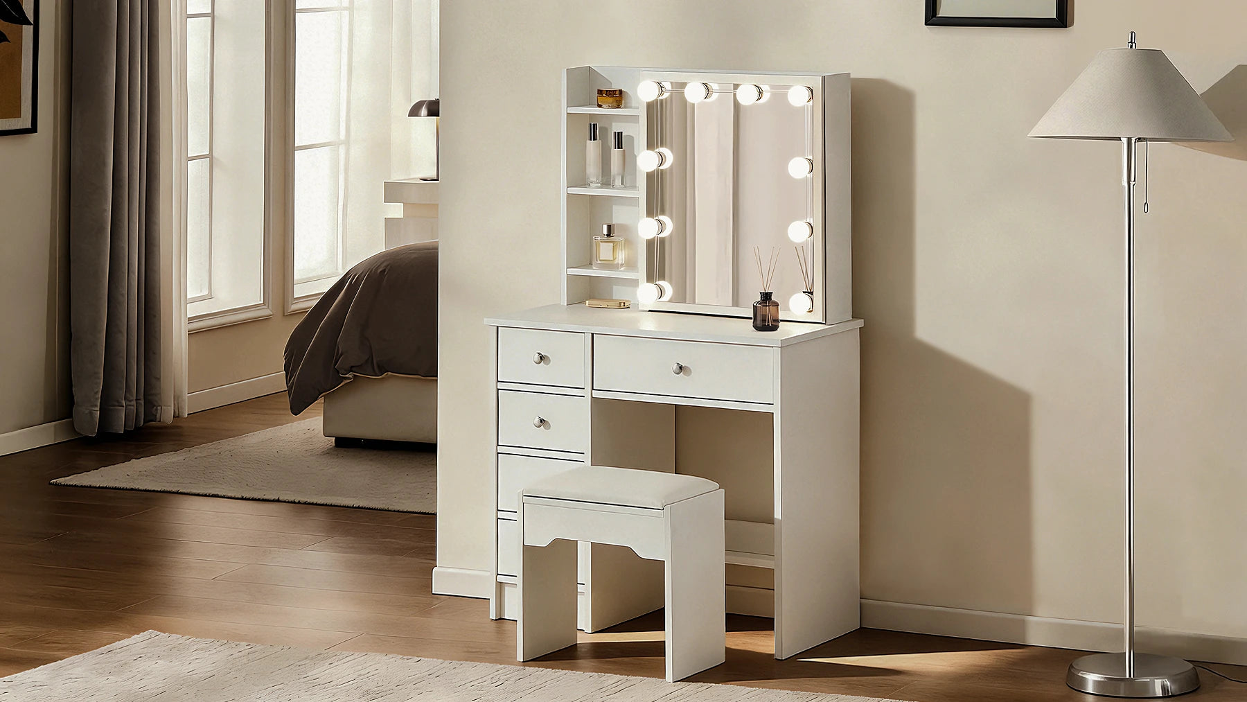 Dies ist ein praktischer Schminktisch für Make-up, Hautpflege und tägliche Beauty-Routinen.