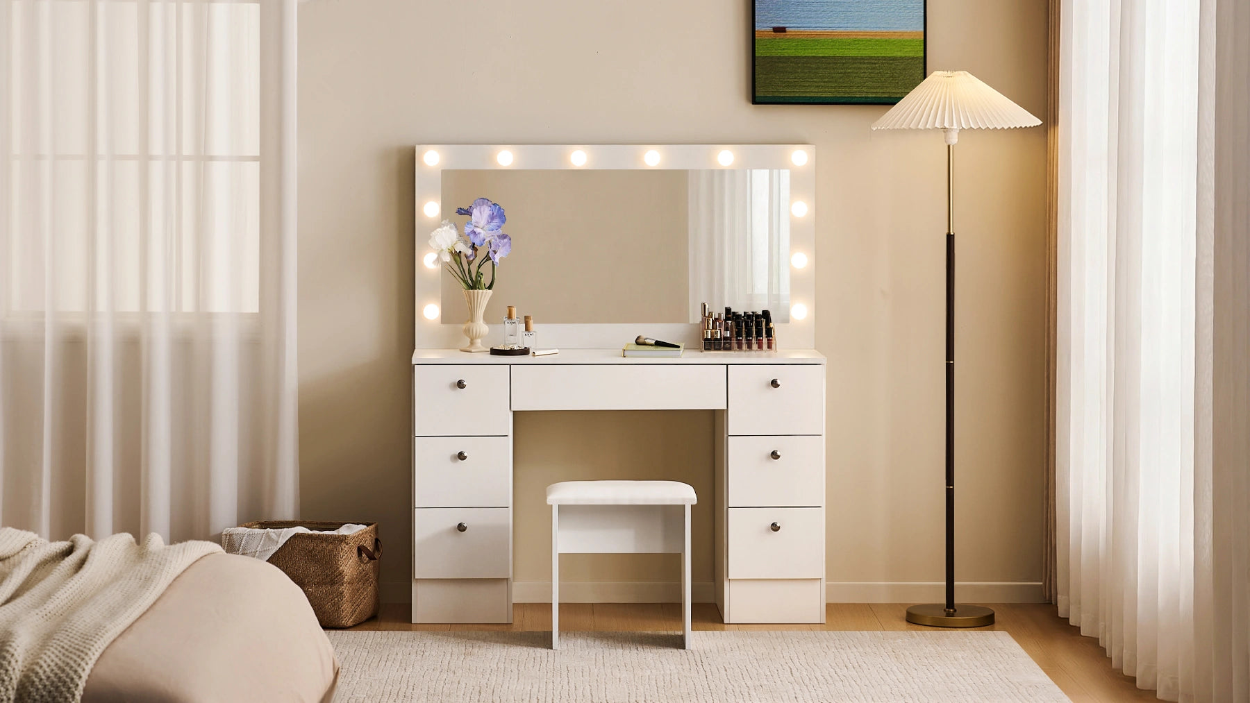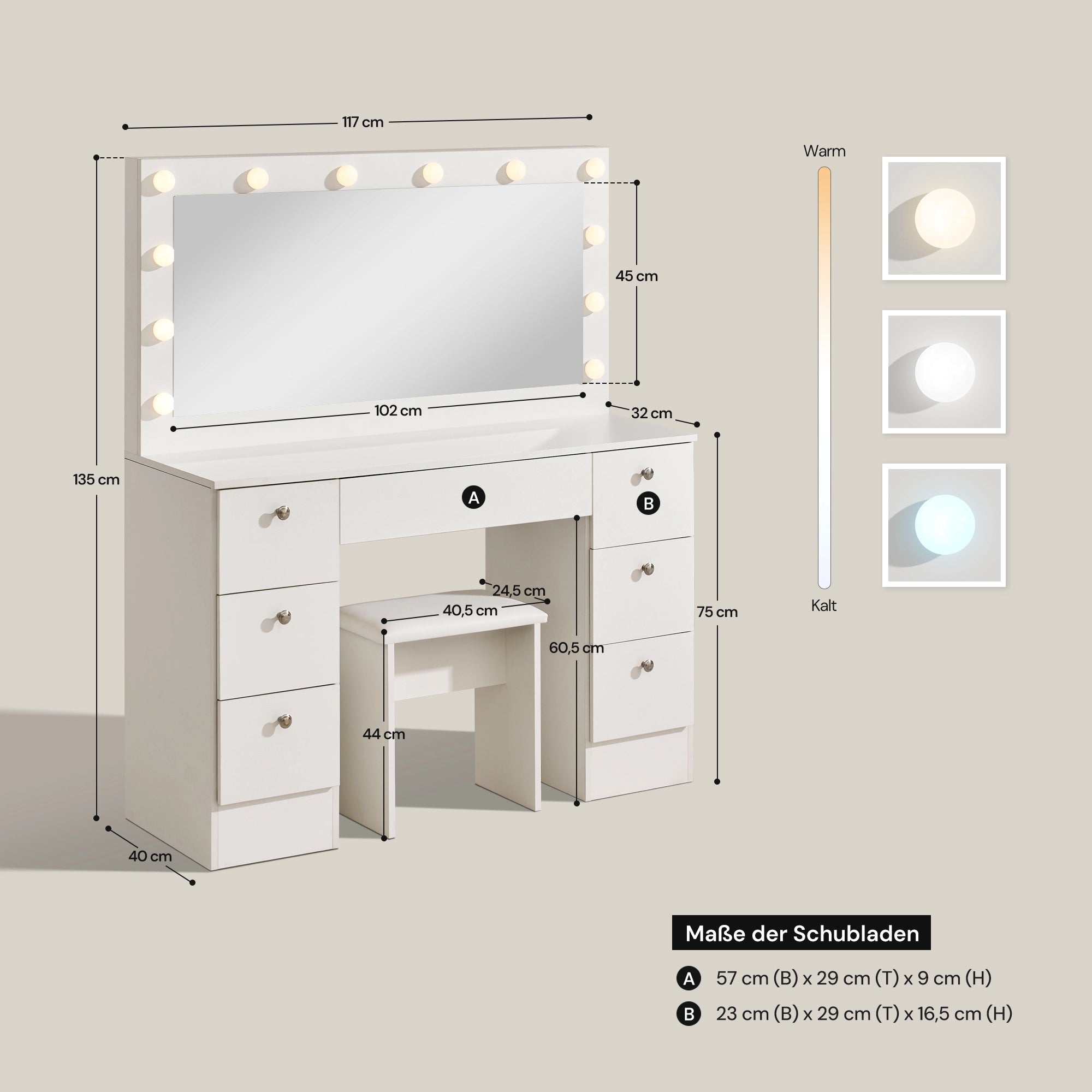 Die breite Tischfläche und 7 praktische Schubladen bieten ausreichend Platz für Kosmetik und Accessoires. Das ausgewogene, symmetrische Design verleiht dem Schminktisch eine moderne und aufgeräumte Optik.