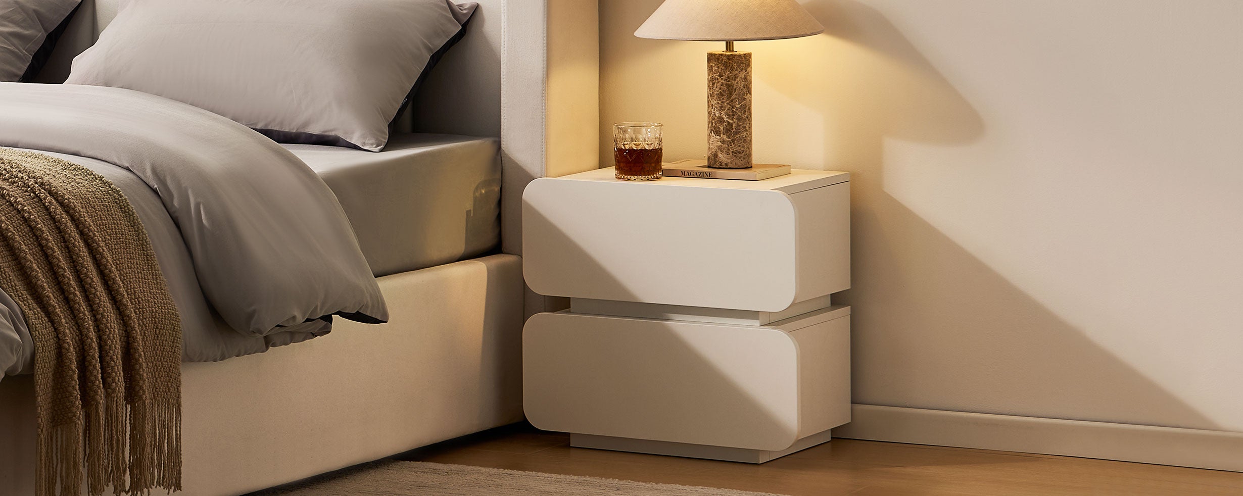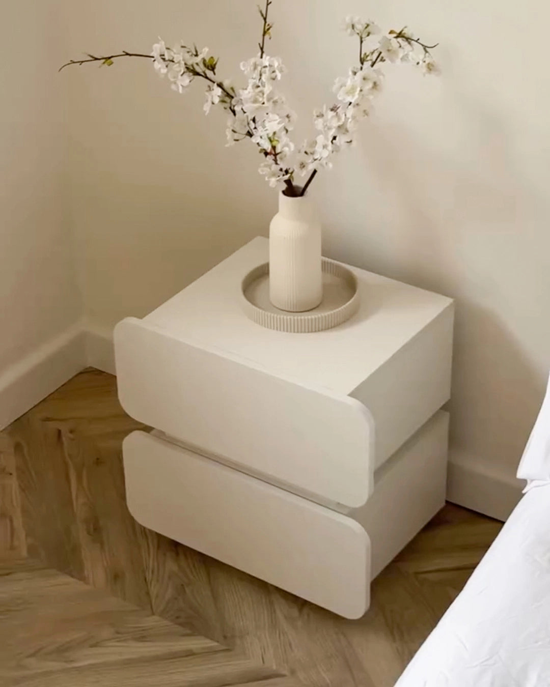 Sanfte Formensprache & harmonischer Weißton. Abgerundete Linien und eine warme Farbgebung schaffen eine ruhige, stilvolle Atmosphäre im Schlafzimmer.